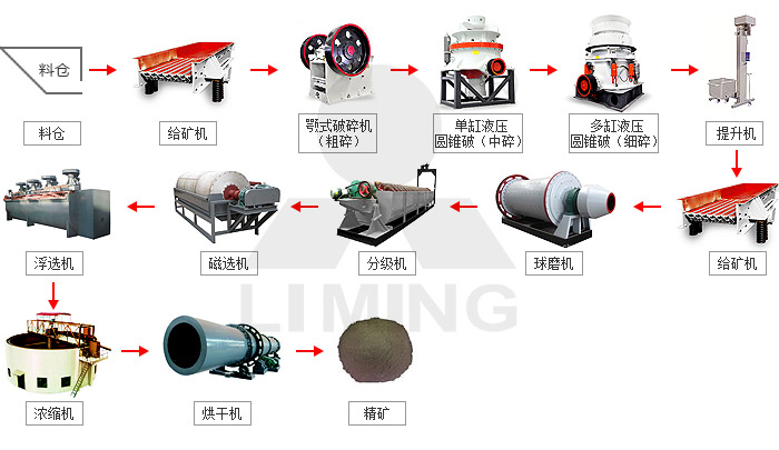 選礦生產線一般分為磁選法和浮選法兩種不同的選取作業方式,具體流程如下:給礦機將開采的礦石送入顎式破碎機進行初步破碎,粗破后的礦石由圓錐破碎機破碎至合理細度后經由提升機、給礦機均勻送入球磨機進行粉碎、研磨。研磨出的礦石進入分級機內,分級機借助固體顆粒比重不同在液體中沉淀速度不同的原理,對礦石混合物進行洗凈、分級。經過洗凈和分級的礦物混合料在經過磁選機時,由于各種礦物的比磁化系數不同,經由磁力和機械力將混合料中的磁性物質分離開來。經過磁選機初步分離后的礦物顆粒再被送入浮選機,根據不同的礦物特性加入不同的藥物,使得所要的礦物質與其他物質分離開。在所要的礦物質被分離出來后,因其含有大量水分,須經濃縮機的初步濃縮,再經烘干機烘干,即可得到干燥的礦物質。