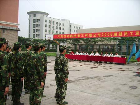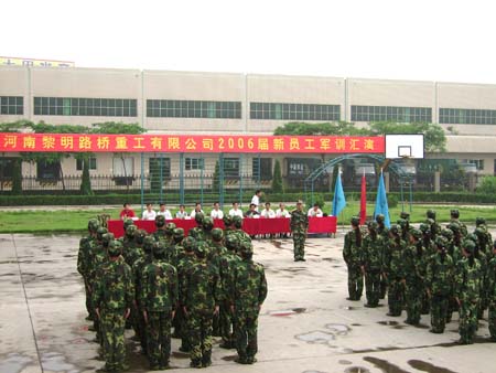 2006年7月12日下午,剛剛下過的一場小雨,驅除了夏日的酷暑。河南黎明路橋重工有限公司2006年新員工軍訓匯演在培訓中心如期進行。楊董事長攜公司部分領導參加了軍訓匯演。所有受訓的新員工以飽滿的精神、整齊的步伐、嚴明的紀律,英姿勃發地接受了各位領導的檢閱。