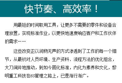 這些改變正以潤物無聲的方式滲透到了工作的每一個細節,從開始對人員環境、生產資料、流程方法的優化組合,大刀闊斧地推動,到如今固化標準,內化為素養和文化,黎明重工科技在6S管理之路上,已是漸行漸廣。