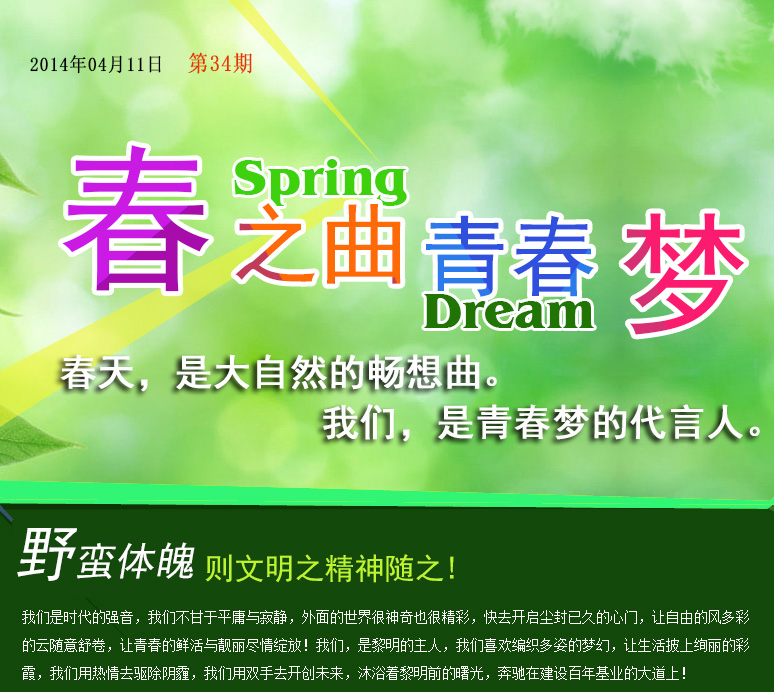 我們是時代的強音,我們不甘于平庸與寂靜,外面的世界很神奇也很精彩,快去開啟塵封已久的心門,讓自由的風多彩的云隨意舒卷,讓青春的鮮活與靚麗盡情綻放!我們,是黎明的主人,我們喜歡編織多姿的夢幻,讓生活披上絢麗的彩霞,我們用熱情去驅除陰霾,我們用雙手去開創未來,沐浴著黎明前的曙光,奔馳在建設百年基業的大道上!