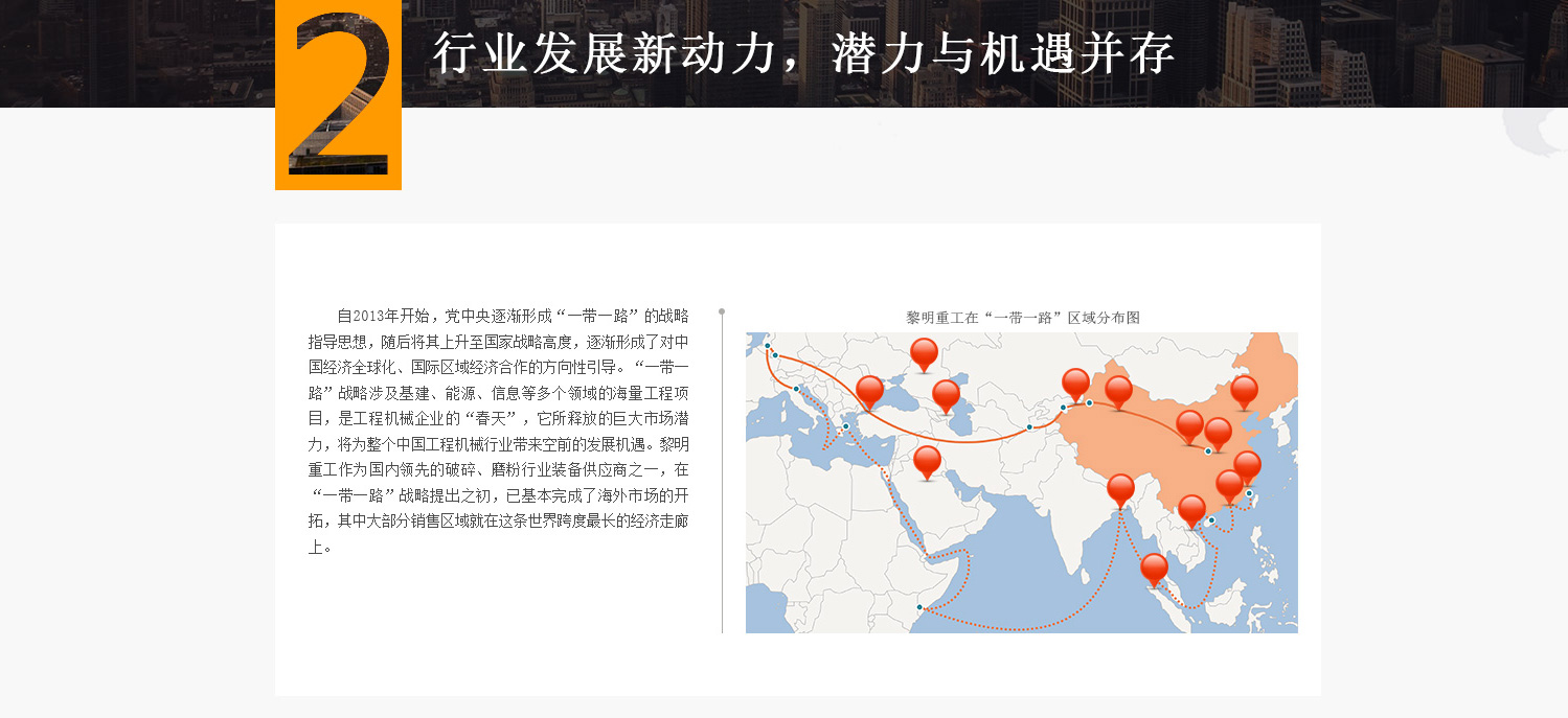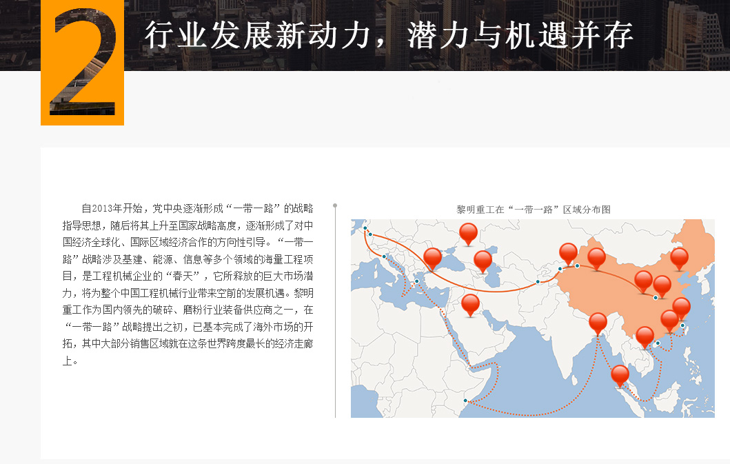 自2013年開始,黨中央逐漸形成“一帶一路倡議”的戰略指導思想,隨后將其上升至國家戰略高度,逐漸形成了對中國經濟全球化、國際區域經濟合作的方向性引導。“一帶一路倡議”戰略涉及基建、能源、信息等多個領域的海量工程項目,是工程機械企業的“春天”,它所釋放的巨大市場潛力,將為整個中國工程機械行業帶來發展機遇。黎明重工作為國內知名的破碎、磨粉行業裝備供應商之一,在“一帶一路倡議”戰略提出之初,已基本完成了海外市場的開拓,其中大部分銷售區域就在這條世界跨度最長的經濟走廊上。